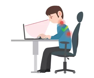 Outre les mouvements répétitifs, l’ordinateur portable est source de traumatismes pour le corps en raison des postures contraignantes que son utilisateur peut adopter lors de son utilisation. En effet, la majeure partie du temps, l’ordinateur est posé sur une table ou un bureau, et est positionné loin devant l’opérateur, afin que celui-ci ait assez de recul par rapport à l’écran et puisse bien voir celui-ci. Cependant, cette position entraine des répercussions sur tout le corps : la tête est penchée en avant à cause de l’écran situé trop bas, le dos se courbe et les bras sont tendus pour pouvoir atteindre le clavier qui n’est pas dissociable de l’écran. Petit à petit, ces zones fortement sollicitées vont devenir douloureuses pour l’opérateur, impactant également la qualité de son travail.