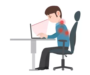 Lors d’une consultation de documents ou prise de notes régulière, la tête effectue des aller-retours réguliers entre le clavier / écran et les documents placés soit sur le côté, soit devant soi. Ces mouvements sont très sollicitants pour les cervicales et peuvent encourager l’apparition de douleurs sur cette zone, ainsi que de la fatigue générale.