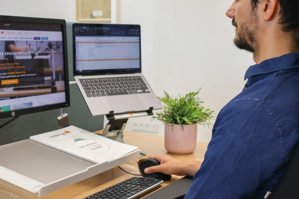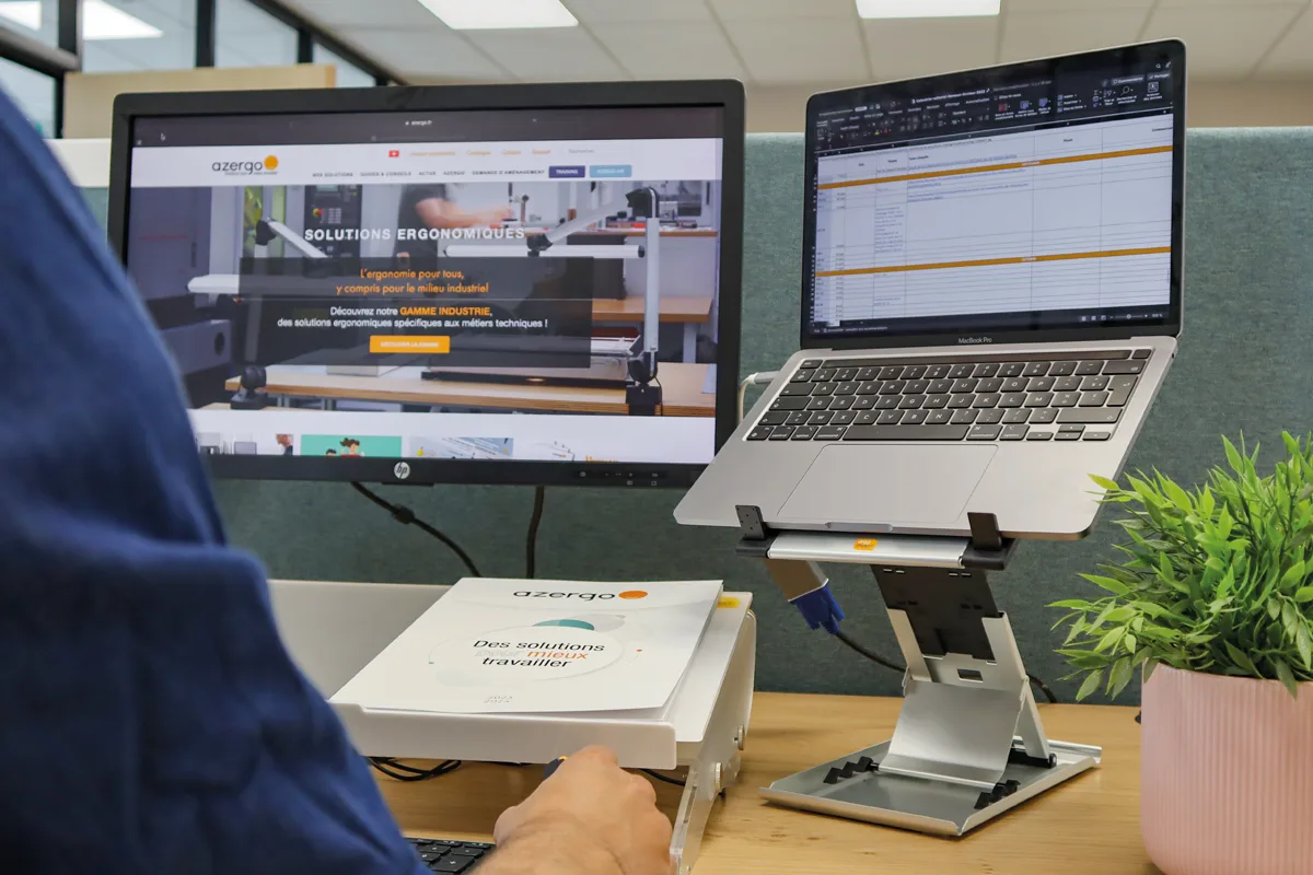 L’écran fait partie intégrante d’un poste de travail informatisé. Mal positionné, il peut générer des postures très contraignantes et favoriser l’apparition de TMS ainsi que l’accroissement de la fatigue visuelle. L’utilisation d’un support d’ordinateur portable vous permet ainsi d’adopter une posture sainte et d’éviter des solicitations trop intense au niveau du cou et de cervicales, tout en offrant un gain d’espace sur votre plan de travail.